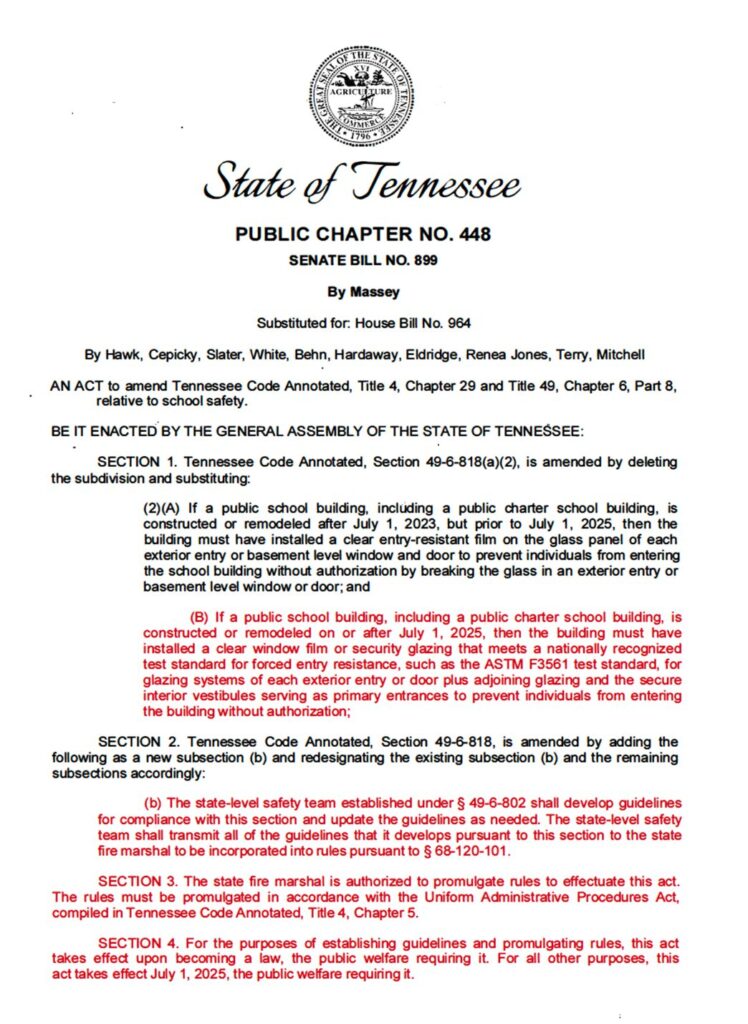 In response to the tragic Covenant School shooting in 2023, the Tennessee General Assembly passed much-needed school safety legislation. This law created a school safety team tasked with considering appropriate building code requirements for new and remodeled school facilities. There were two areas within the original statute requiring clarification to ensure schools, designers, and local education agencies (LEAs) could implement effective safety measures without confusion or delay.