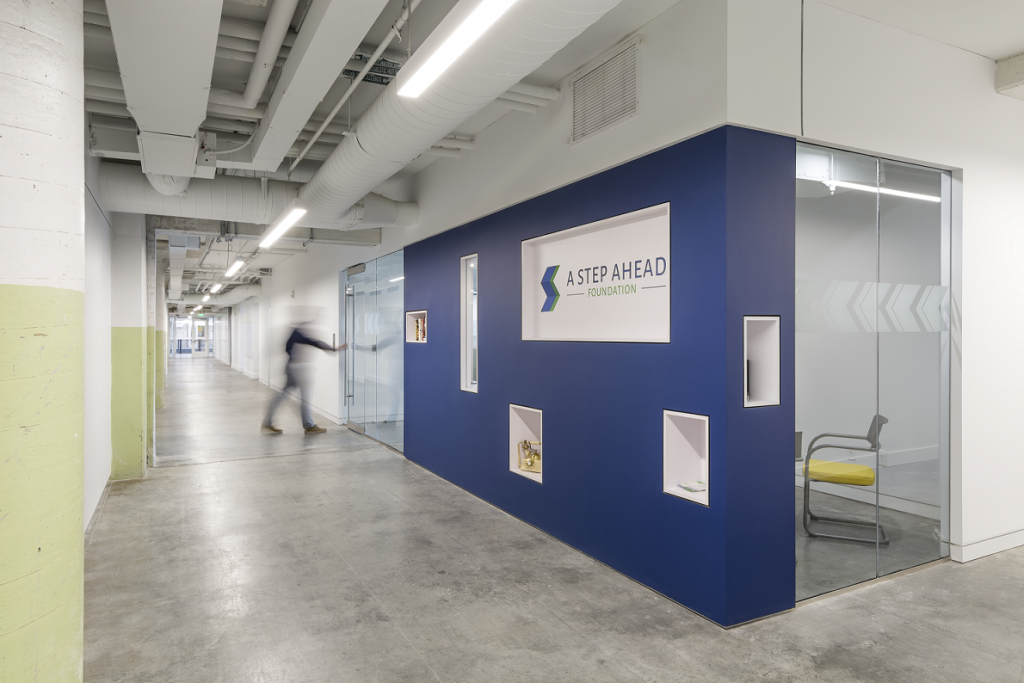 To create a feeling of openness, and to work within a modest budget, the original concrete ceilings were left exposed. A series of bulkheads with dark-blue interiors define work zones. These zones participate in a strategy of progressively eroding private offices along the corridor toward the day-lit exterior face of the building. Desired sightlines were identified to perforate the forms and create functional connections. The simple detailing and palette of white and dark-blue paint, maple millwork, and yellow accents participate in promoting the organization’s growth, outreach, and brand.