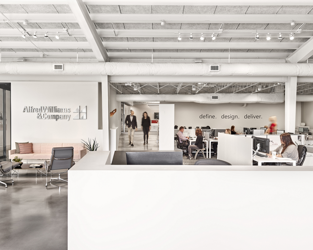 Through their partnership with Herman Miller, Alfred Williams & Company is utilizing their new space as a laboratory for the “Living Office,” a work environment that harnesses natural motivations and compels quality work. Living Office proposes a shift from standardized workstations and generic meeting rooms to a diverse landscape of purposeful settings. The freeform building plan employed provides abundant flexibility and accommodates activation beyond 8am-5pm with workspace doubling as casual gathering and event space.