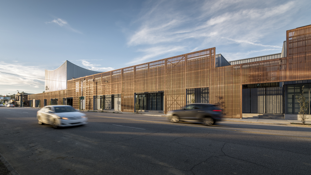 The copper screen sits at the historic street edge—enhancing the urban experience within an entertainment district—while complying with current city codes and setbacks. The building’s façade offers opportunities for the community to participate in the organization, via exterior courtyards, retail experiences, and a café, and a costume shop featuring a display window/mini-performance place.