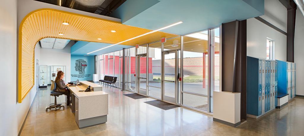 This new construction project challenged the design team to consider materials, systems, and assemblies from various perspectives. The goal was to deliver a creative and productive environment for students & staff. Their solution involved a selection of quality systems in tandem with cost efficiency, building orientation and design aesthetics. The school refers to their students as “executives”, so the idea was to place student in a more “corporate” like environment to solidify the core objective of business focused education. The single story pre-engineered metal frame building was designed to meet the best practices for sustainable design to minimize the impact on the environment, although the project did not pursue the LEED for Schools certification.