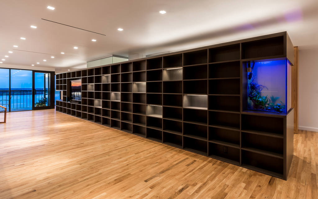 Three elements organize the 1,500 SF dwelling. The primary element is a charcoal stained oak veneer monolith of shelving, used to divide the space about the long axis, while also displaying the smaller artifacts within the art collection. This monolith is caped on one end by a fireplace and the other a fish tank. A cradle of lighter, contrasting oak veneer holds the space, wrapping up three of the four perimeter walls. This wooden cradle translates into an art viewing bench, the kitchen millwork, storage spaces for the office and bedroom, and built-in furniture. The restrooms are contained within a glass box impacting the directionality of the gallery/dwelling minimally.