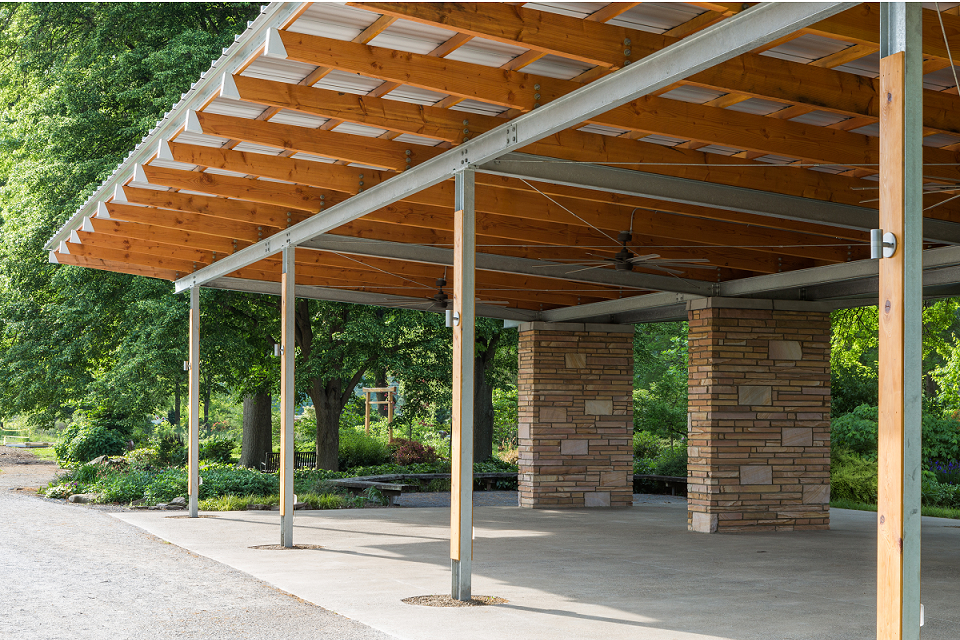 The 4 central piers are clad in native crab orchard stone. With a roof structure composed of layers natural fir timbers and purlins supported by a galvanized steel structural system. The materials palette is reflective of some of the materials already found within the research campus and complementary to materials and plantings found within the garden. Now complete, the pavilion provides a fitting setting for educational and cultural events while also serving as a much needed revenue source funding research and community outreach initiatives which are at the core of the mission of the UT Gardens.