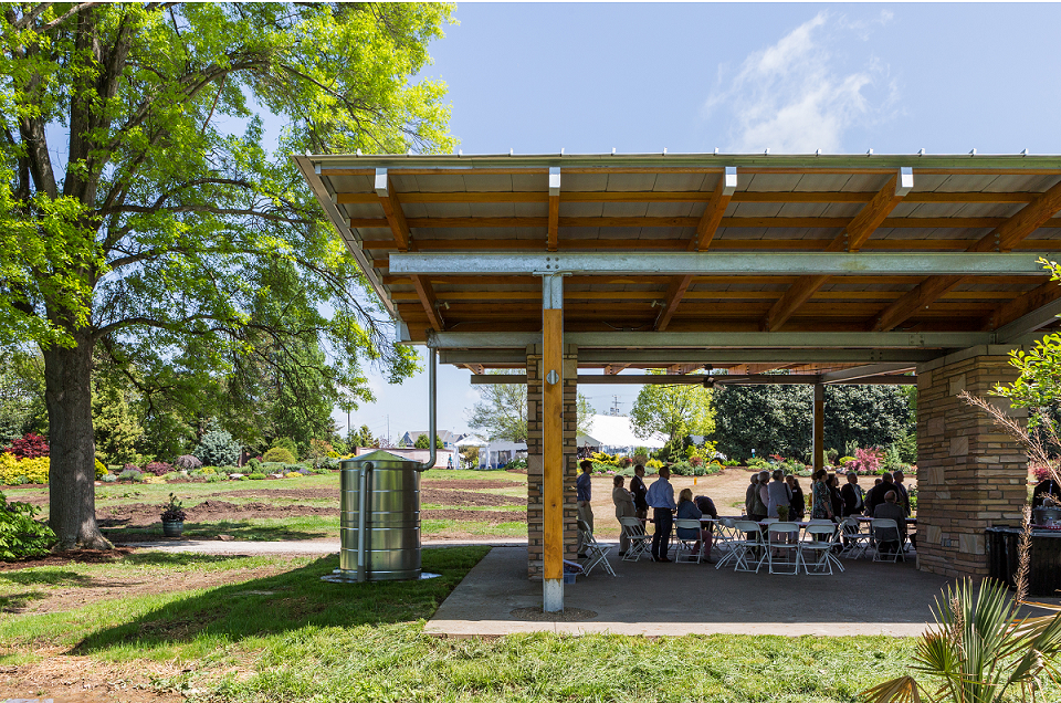 In order to keep the focus on the plantings within the garden, a solution which limits the profile and visual impact of the 60’ long structure was proposed. 4 central piers anchor the structure and provide a base for the low-slope butterfly roof which sets a horizontal datum underneath the canopy of two rows of mature oak trees. This roof directs rainwater to a 500 gallon cistern which provides irrigation for plantings while serving as an educational opportunity for students and Garden visitors.