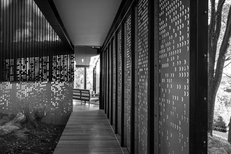 The siting of the house created a nice play between the built structure and the landscape. The detailing of the screens was particularly strong – creating separation of space and creating interesting and changing patterns of light. We felt the entry sequence very well choreographed – from the driveway, to the garage, to moving into the house and through the house. The quality of detail was excellent throughout the house. So many different places to enjoy views of the surrounding landscape.