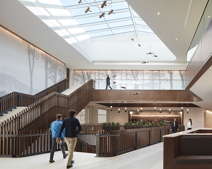 Jurors felt the central atrium space was a particularly strong design element of the project – with pixelated trees and floating birds adding special points of interest. Overall the designers delivered consistency and interest within a muted and elegant palette of color and materials.