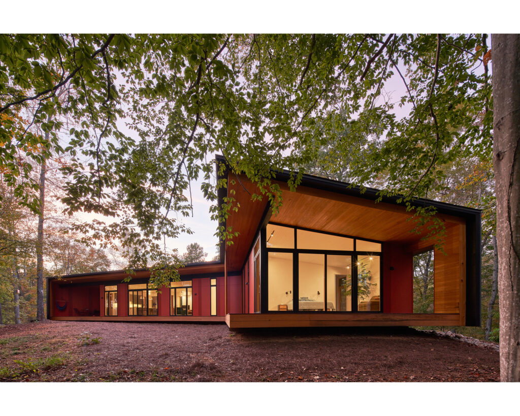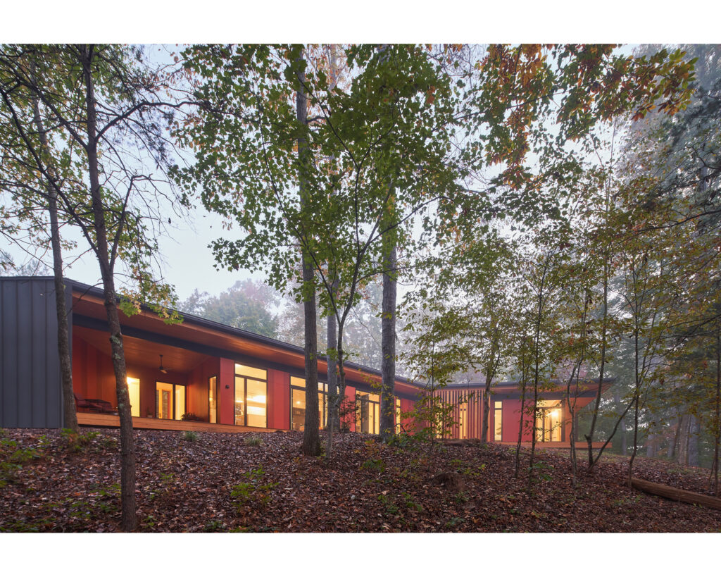 The jurors were taken by the minimalism, simplicity, and elegance of this home design. They commented on its sophistication and site lines. The siting was meticulously thought through, and very poetic. Reminded me of finished pavilions and European care about sites, materiality and orientation. Description of the fiber cement board painted to match fall foliage gives a nice pop of color. Overall, an excellent project with clear concept, geometry and quality materials.