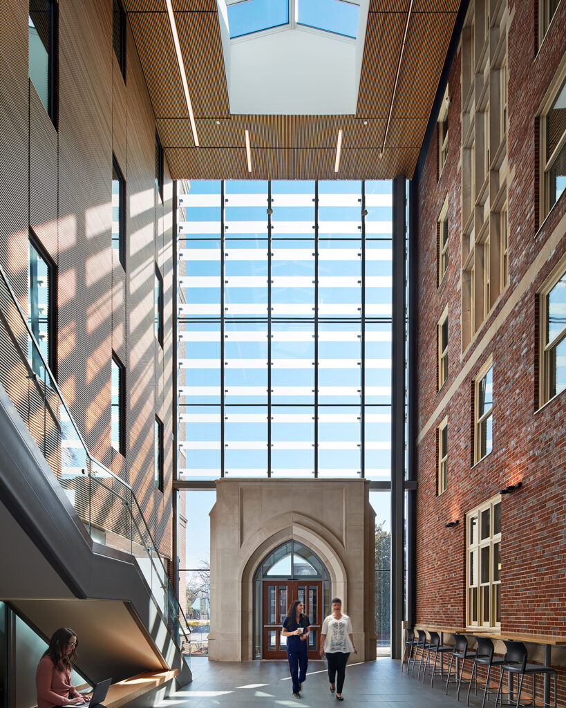 Juror remarked on the clean design and clarity of thinking by embedding a bold vertical glass circulation portal to connect historic buildings and new structures. Well designed transitional spaces create a delicate touch between new and old.