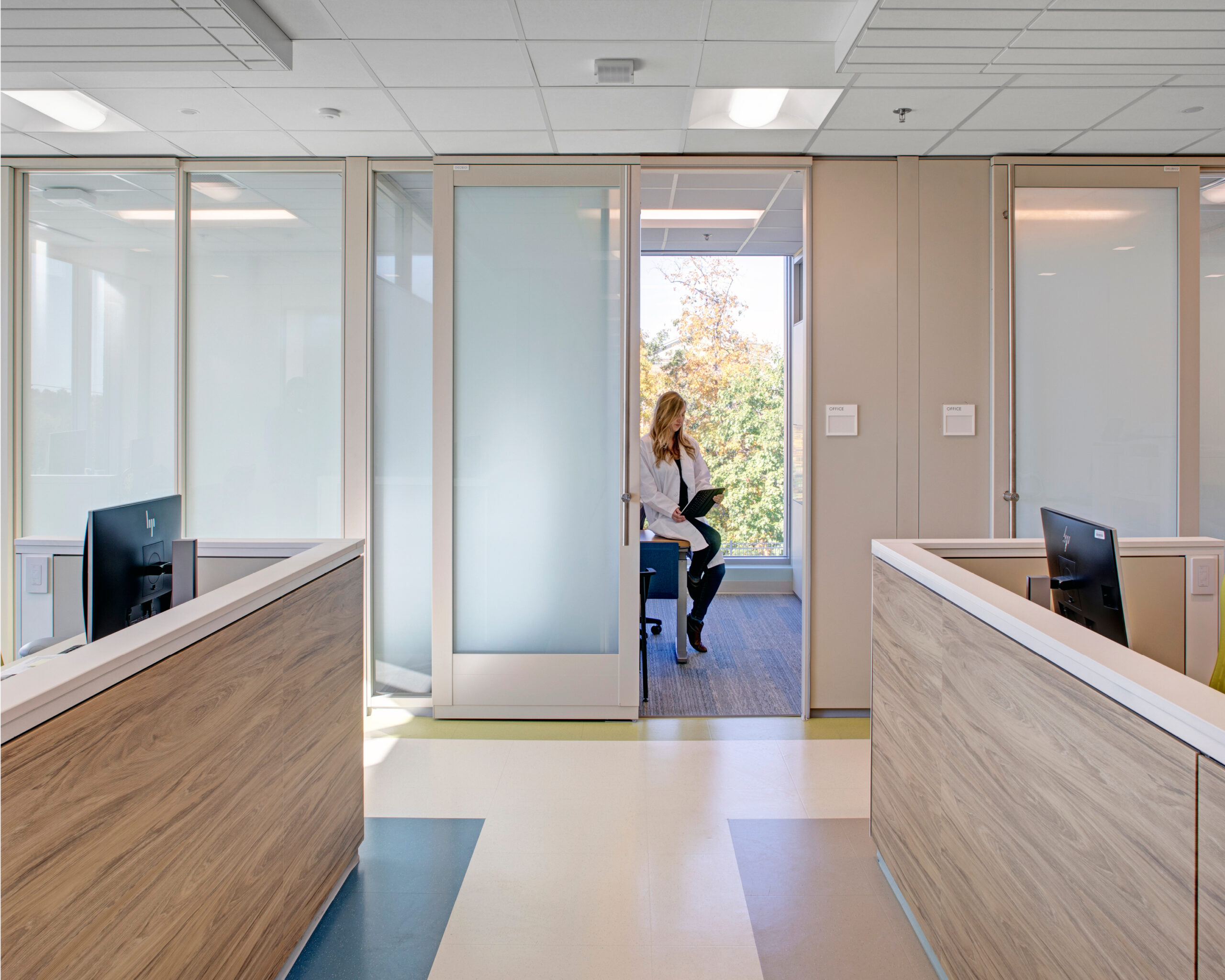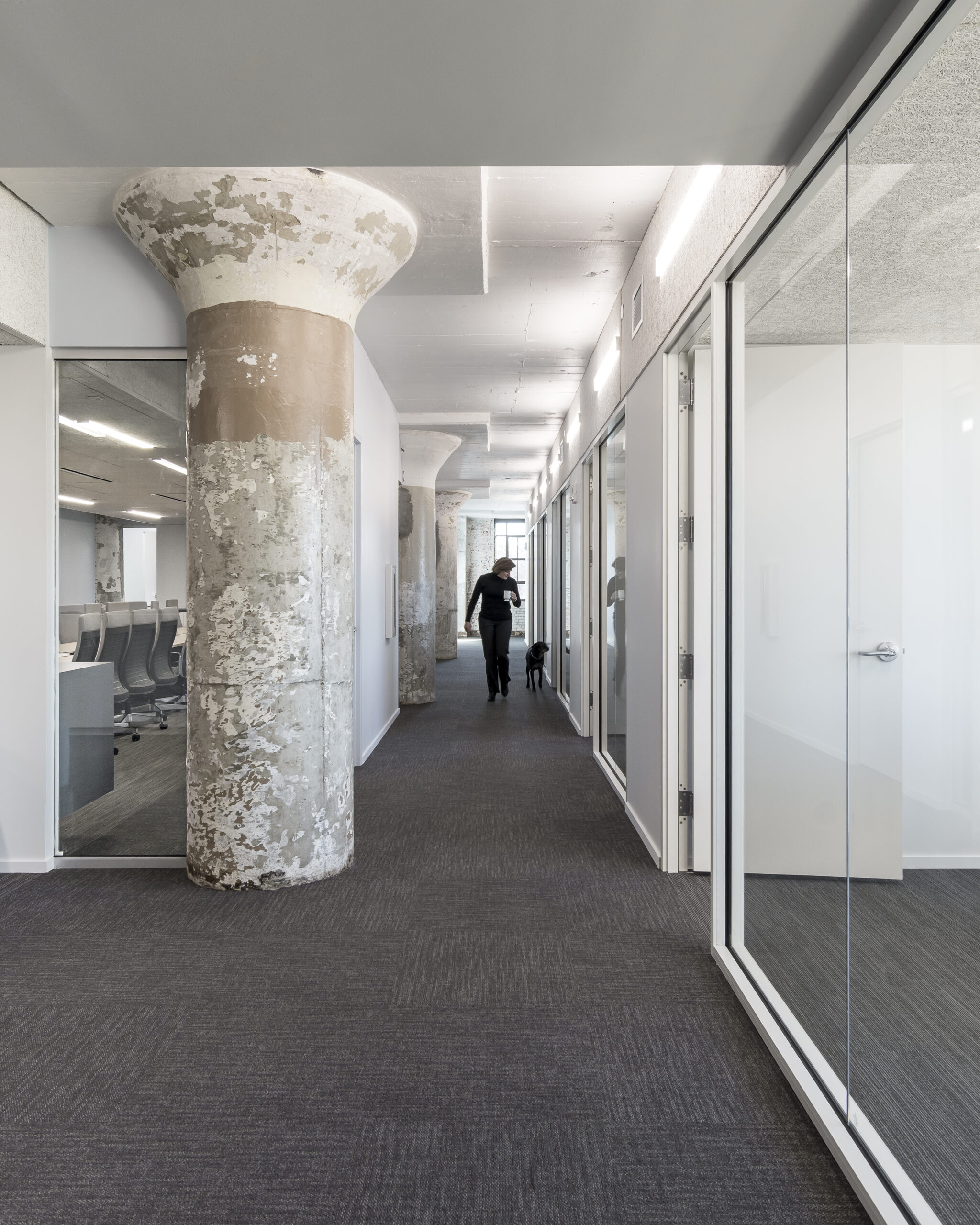 Jury Comments: This project is a simple palette deployed expertly in a small tenant space within a large building and with modest means. The jury applauds the simplicity of the design intent and the straightforward approach. The existing conditions generated significant constraints, most prominent the enormous concrete columns. Decisions to elevate the raw and to avoid superfluous finishes, including subtracting material in the case of sand-blasting, reduces virgin material use but also adds character and history to the otherwise minimal design. The approach to detailing yields a refreshingly understated, minimal, and poetic quality that speaks to the programmatically desired atmosphere of tranquility.